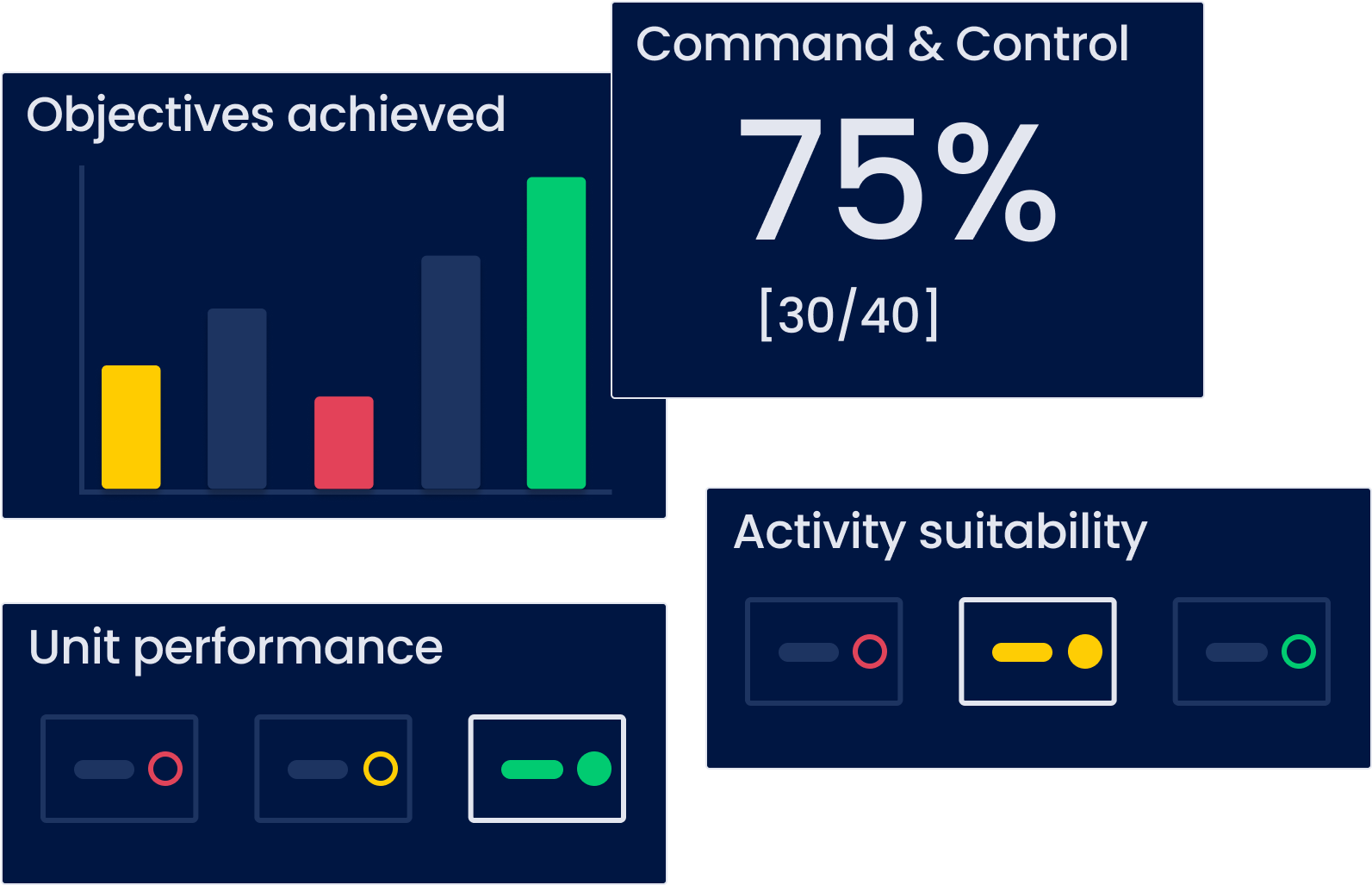 With real-time visualizations, instructors, commanders, and key stakeholders gain a clear overview from the start and continuously track progression over time.